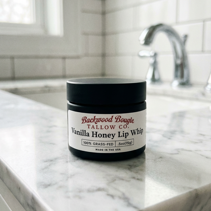 Our Vanilla Honey Lip Whip is a luxurious blend of grass-fed, grass-finished tallow, raw honey, olive oil, rosehip seed oil, and beeswax, whipped into a smooth, creamy balm that melts instantly into the lips. The result is deep, lasting hydration with a hint of natural vanilla sweetness — no artificial flavors, fillers, or fragrances.