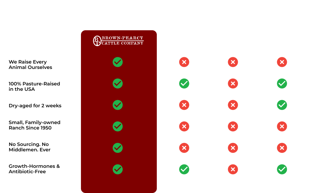 Read AllAt Brown Pearcy we raise every animal ourselves—something most premium meat brands can’t say. With 75+ years of genetic records and hands-on ranching, our Prime Angus Beef and Heritage Berkshire Pork offer unmatched taste, texture, and integrity. All our animals are raised on our open spray-free pastures. No added growth hormones. No antibiotics. No unneccessary vaccines. Just superior meat, straight from our Missouri ranch to your plate. The cleanest, purest meat available on the market.